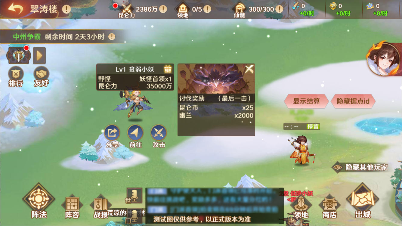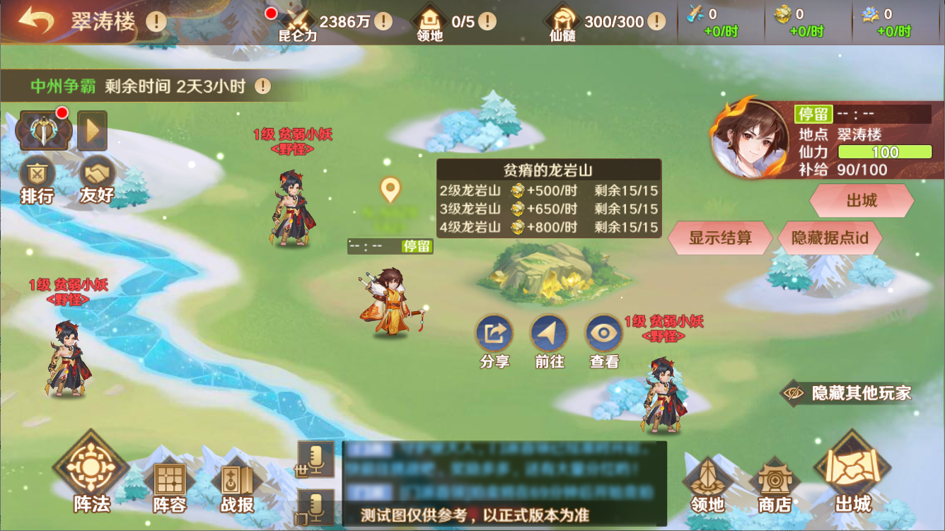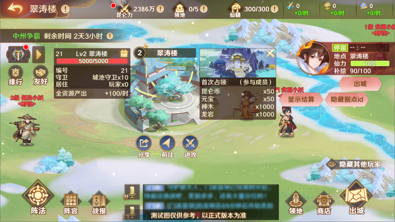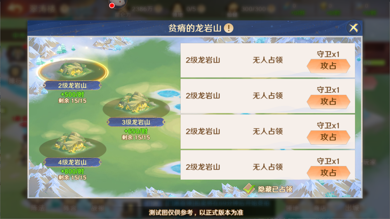 在各个地块内,存在众多资源点,若能击败守卫,将其中的一块风水宝地变为自身的领地,便能定时收取昆仑仙境的各种特殊资源。如果进攻守卫失败,守卫将在一定时间后重置,如果成功攻占土地,土地将会进入一定时间的免战状态。