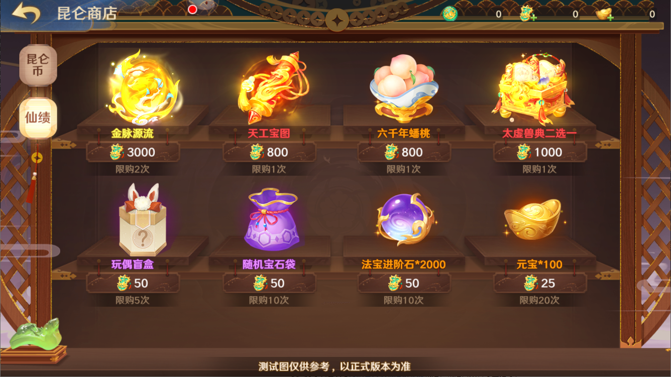 而仙绩则能在昆仑商店新增的仙绩分页,兑换金脉源流、天工宝图、六千年蟠桃、太虚兽典二选一、玩偶盲盒等奖励。