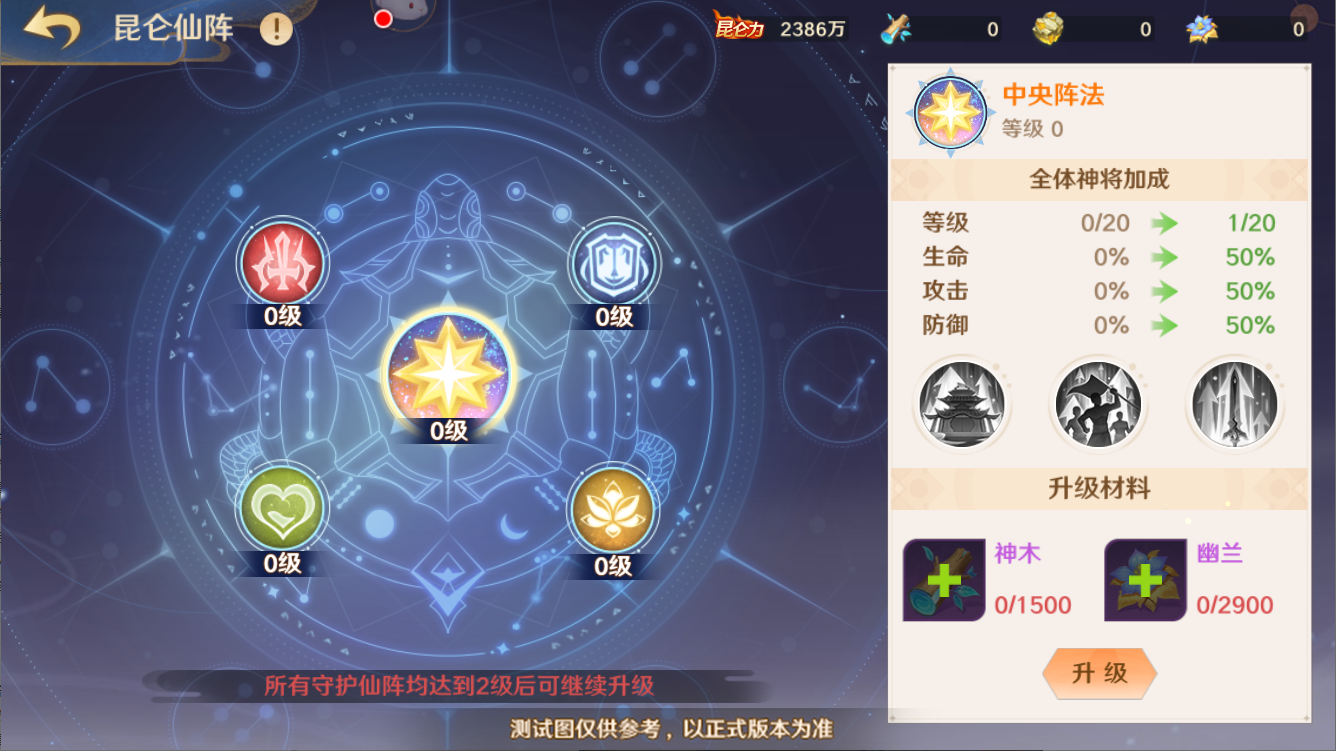 在昆仑仙境中,守护使可以消耗从领地中获得的各类资源(紫霄神木、龙岩晶石、幻月幽兰)升级阵法,提升对应神将的各种属性。