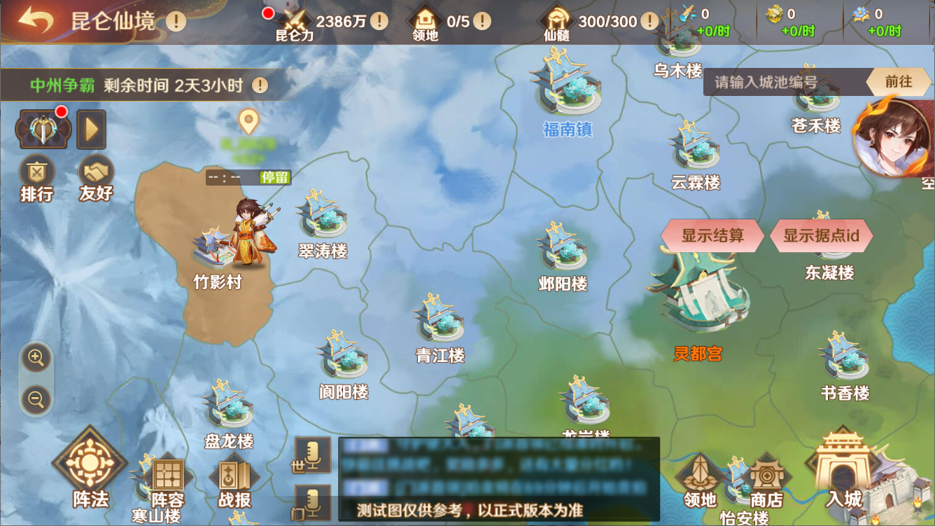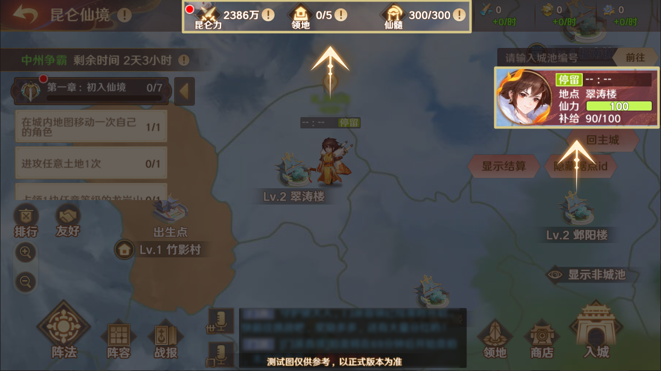昆仑仙境的各处地块中,都有一座城池,占领城池即可占领该处地块。