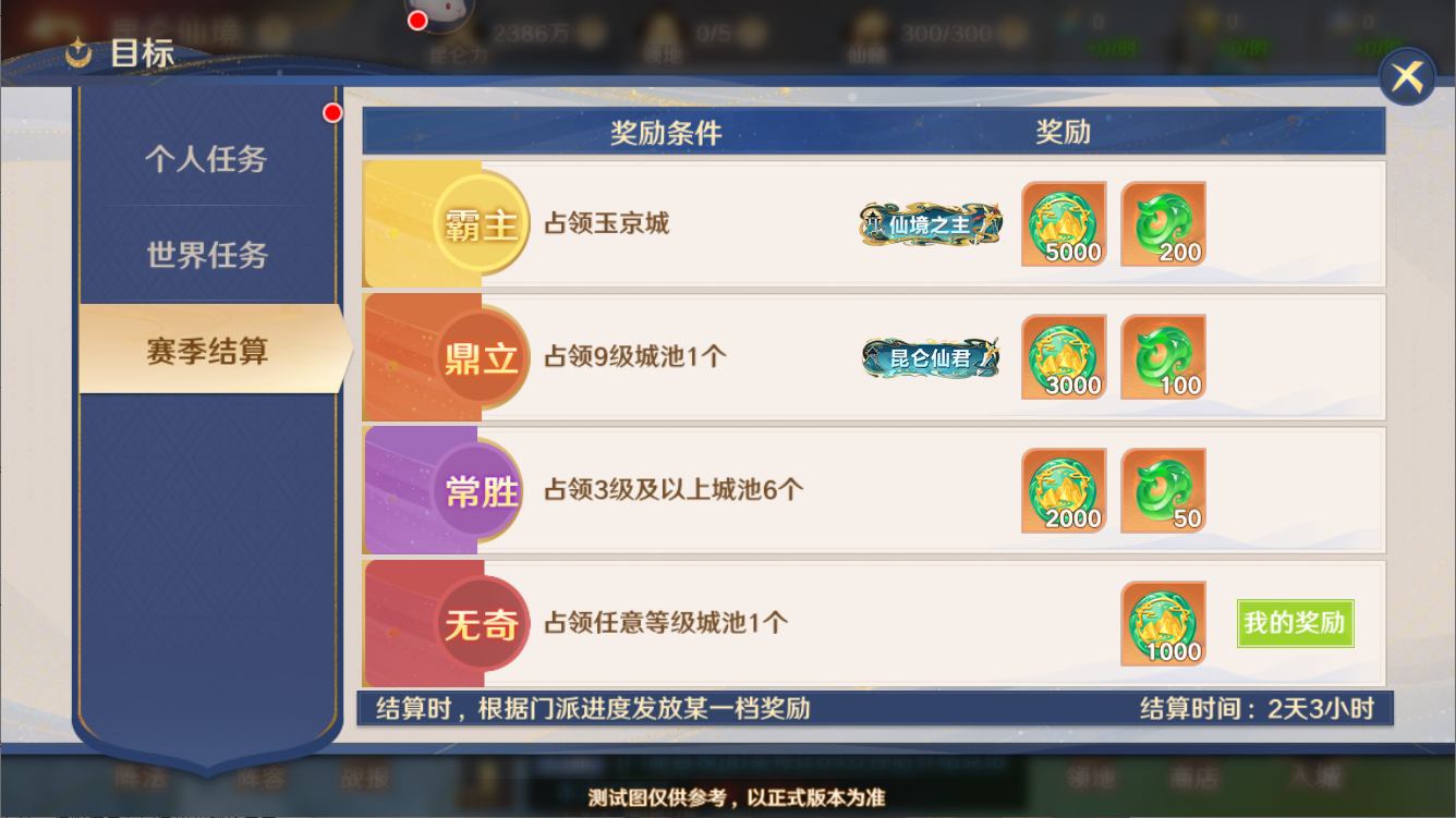 完成个人与世界任务,将能获得昆仑币和元宝等道具奖励。在本期活动中,需要所有守护使击败一定次数野怪的任务难度下调,仙境内所有守护使一共击败野怪10000次即可完成任务。