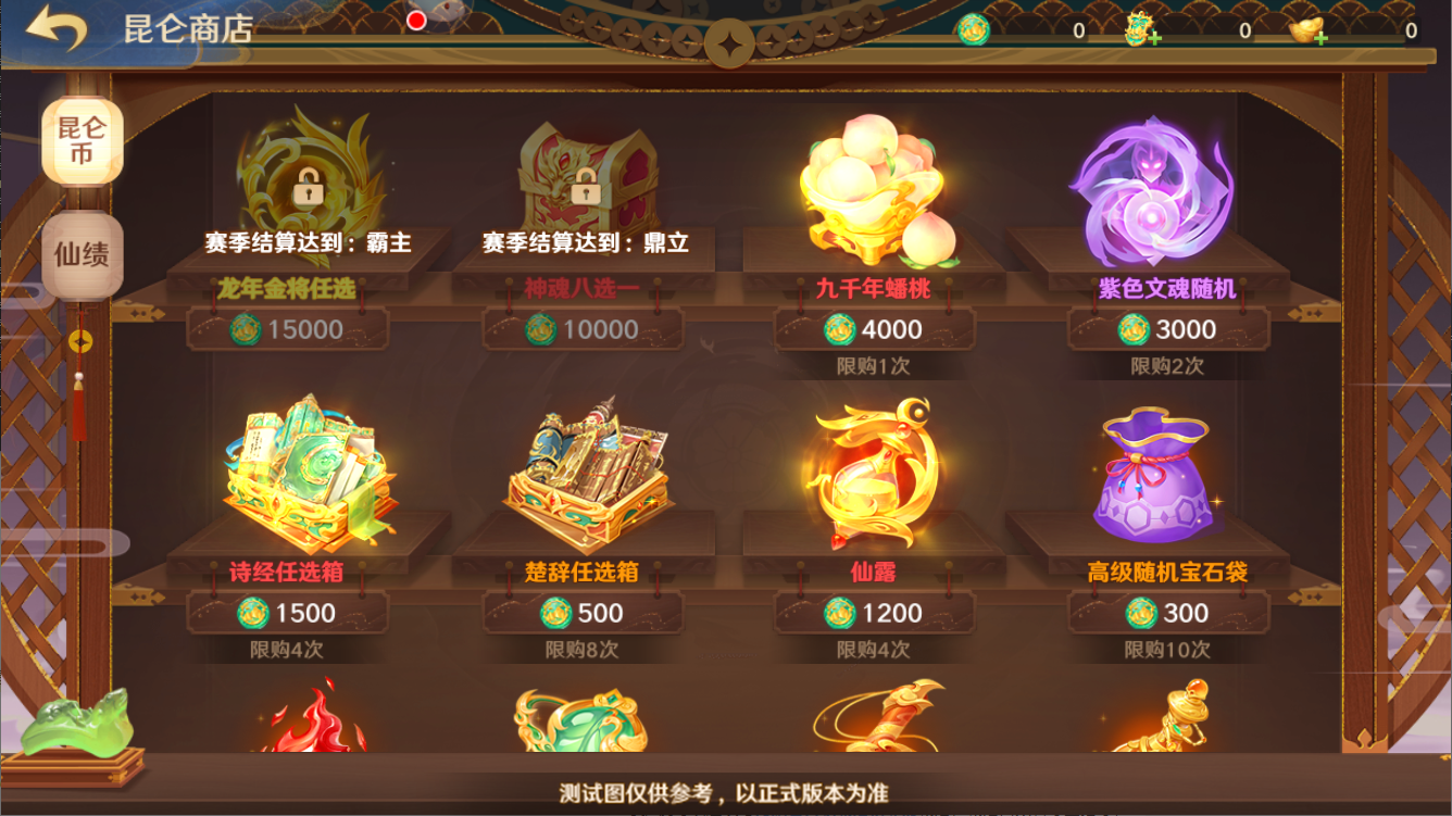 本期活动中,昆仑币可在昆仑商店内兑换九千年蟠桃、紫色文魂随机、诗经任选箱、楚辞任选箱、仙露、高级随机宝石袋等奖励。若能在赛季结算中达到鼎立甚至霸主级别,则还可在商店中分别解锁龙年金将任选和神魂八选一的兑换资格。