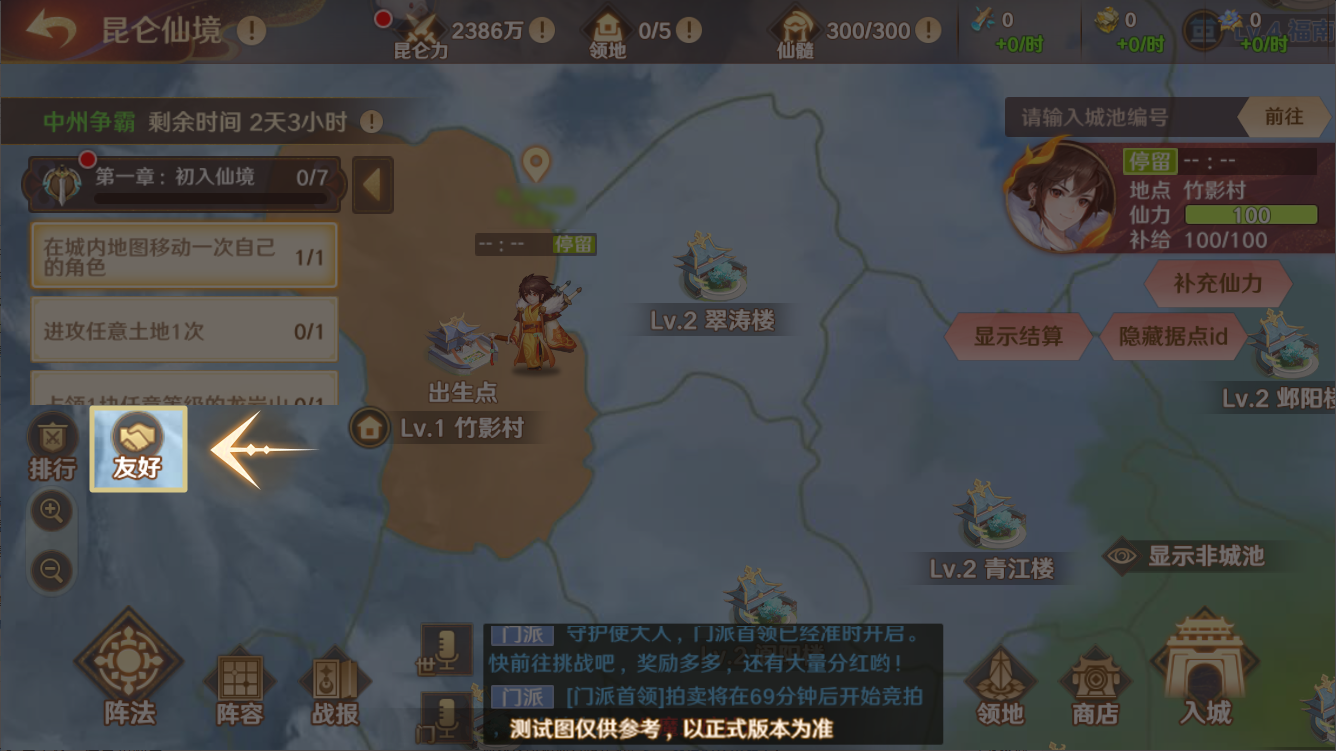 门派掌门/副掌门可通过点击活动主界面左侧的「友好」按钮,结交任一门派成为友好关系,成为友好关系的门派互相之间可连接土地、互守据点。