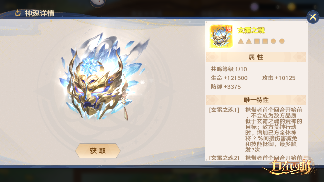 满星玄霜之魂:携带者和己方除自身外攻击最高的神将首个回合开始前,不会成为敌方品质低于玄霜之魂的战灵和荒神的目标;敌方战灵或荒神行动时,增加己方全体神将一定百分比的间接伤害减免和技能抵御,最多触发3次。