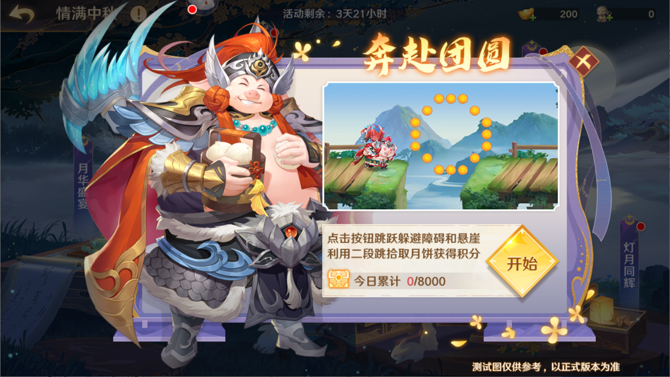 开始小游戏后,守护使大人需点击右方按钮,来帮助八戒躲避障碍和悬崖,拾取途中的月饼能够累计积分,获取揽月顽猴等奖励。