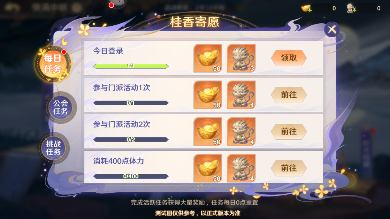 在桂香寄愿板块,守护使大人可通过完成每日任务和公会任务,来获得大量道具奖励,这两种任务将会在每日0点重置,此外,还有挑战任务等待守护使前来完成,记得每天都来看看哦~