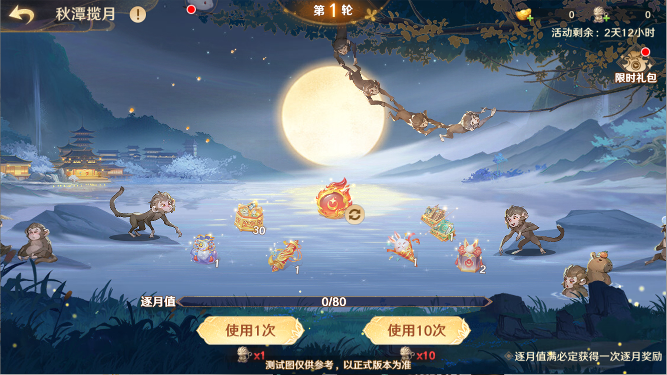 活动期间守护使大人可以在秋潭揽月-限时礼包中使用元宝购买揽月顽猴*10。每日还可以免费领取揽月顽猴*1。