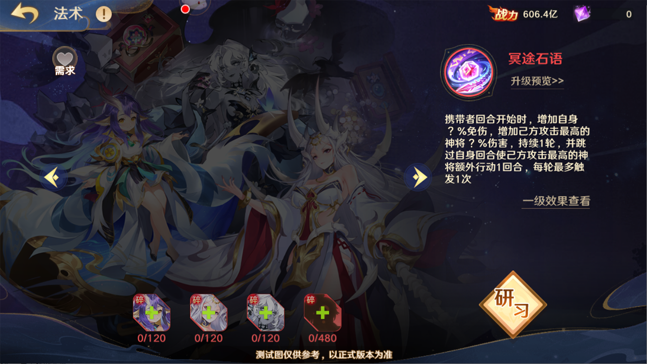 冥途石语为红色品质的羁绊法术,消耗一定数量的石矶娘娘、白骨夫人、谛听碎片即可激活并培养。