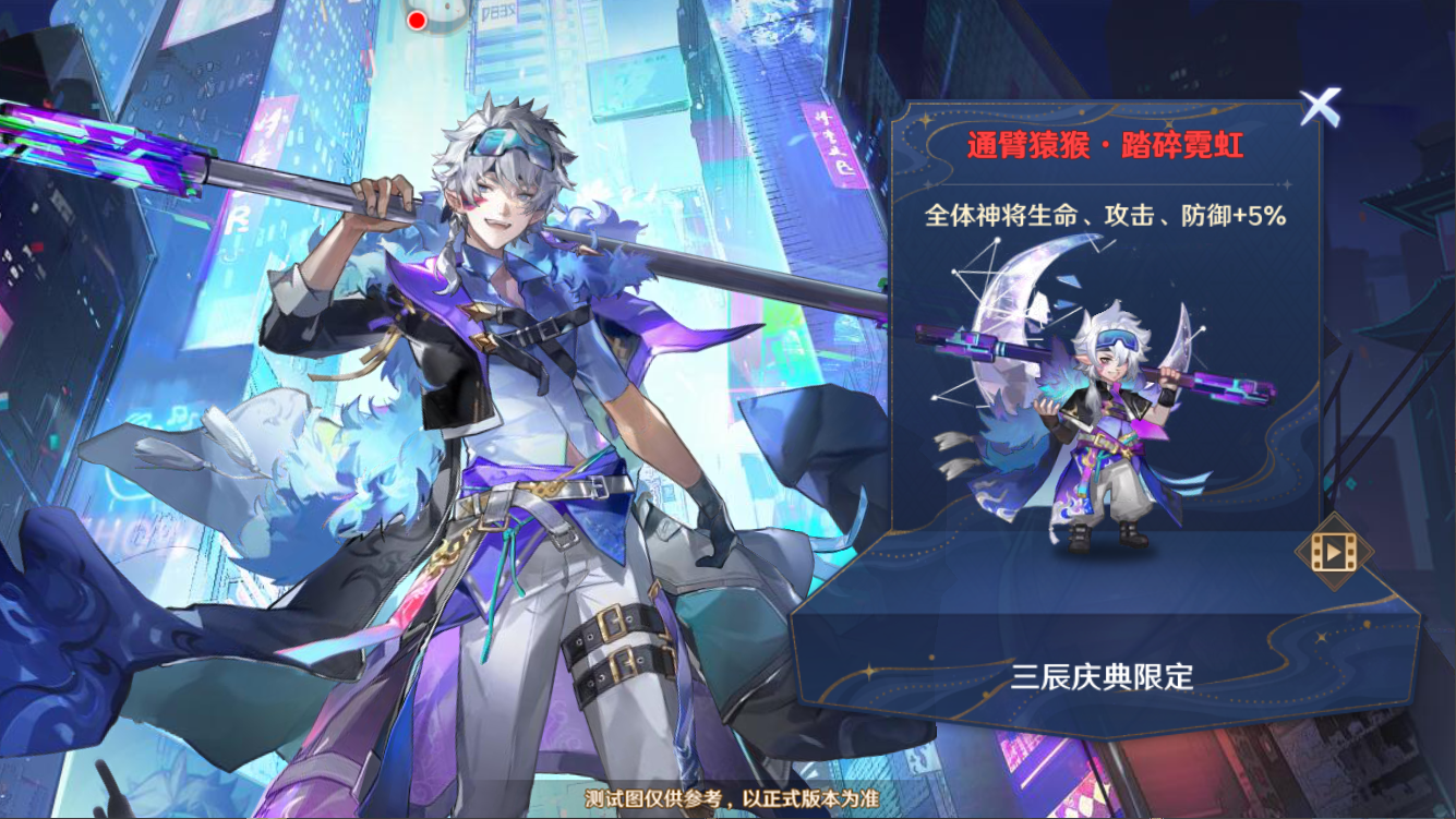 本次更新后,服务器将更新通臂猿猴周年限定装饰,包括限定皮肤-踏碎霓虹、限定头像框以及限定称号,守护使可通过周年庆-赛博协议活动购买获得。