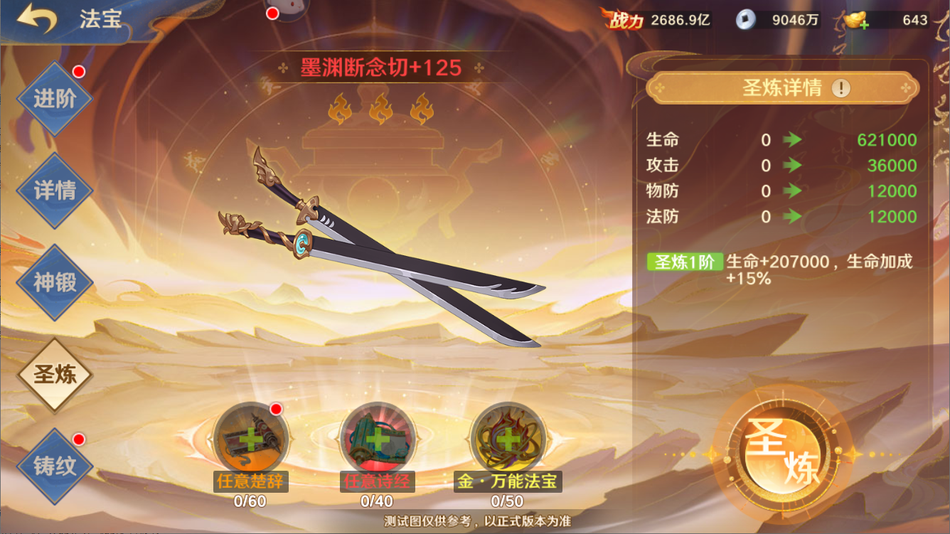 本次更新后,满足条件的服务器将开放法宝圣炼功能,完成圣炼培养后可使主角法宝由红色升品为金色品质,大幅度提升法宝属性。
