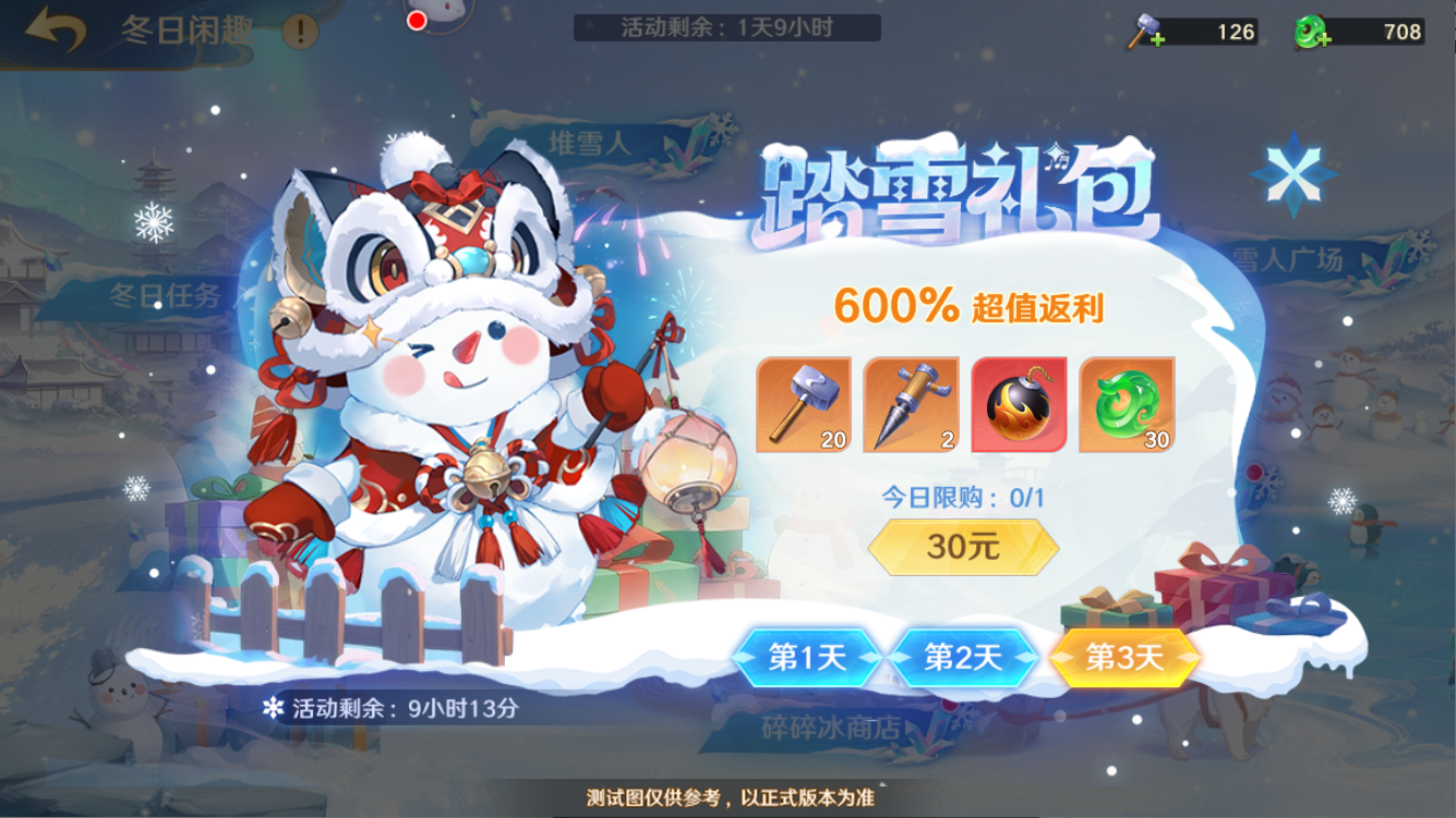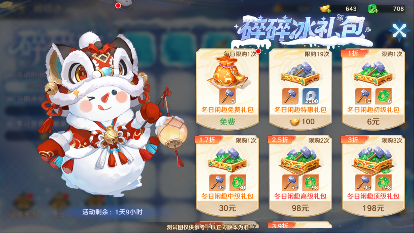 活动开启的三天里,每天都会解锁一个踏雪礼包,守护使可以在此以优惠价格入手活动道具「冰锤」、「金刚钻」、「破冰炸弹」和仙玉。