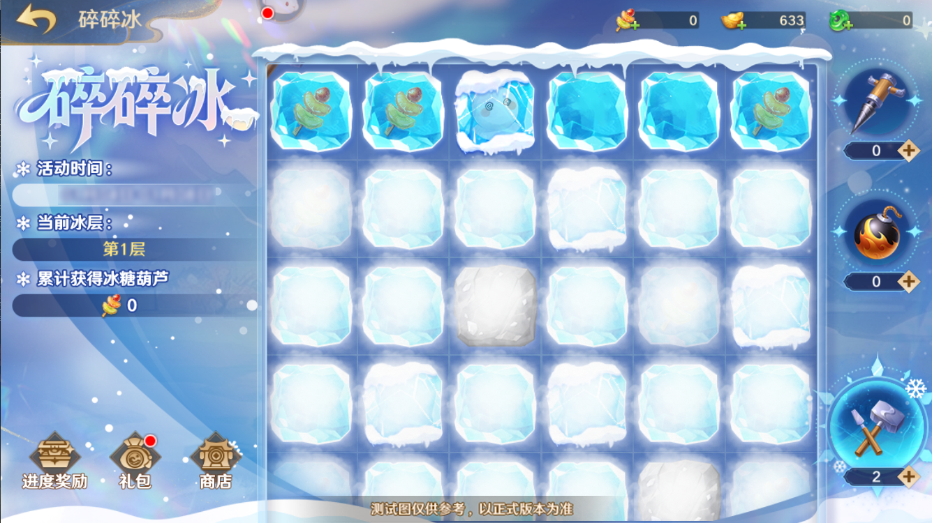 随着破冰进度逐渐增加,守护使能通过点击左下角的[进度奖励]按钮,来领取对应的碎碎冰层数奖励。此外,守护使还能在同样位于左下角的[商店]处,补充破冰道具,活动期间守护使可以在商店以元宝购买「冰锤」*20,还能每日免费领取3个「冰锤」,快去那边逛逛吧~