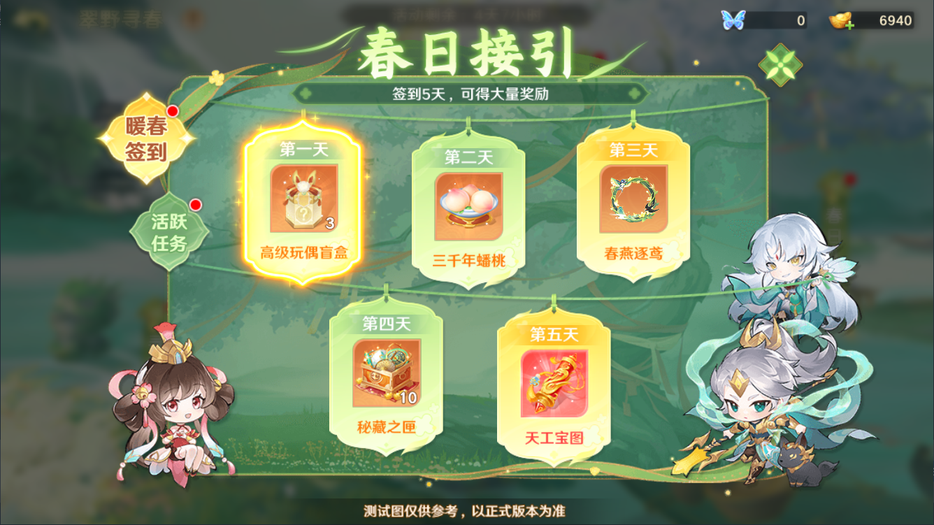 守护使大人每日在春日接引中进行签到即可获得奖励,奖励包括:高级玩偶盲盒*3、三千年蟠桃*1、头像框·春燕逐鸢、秘藏之匣*10以及天工宝图!