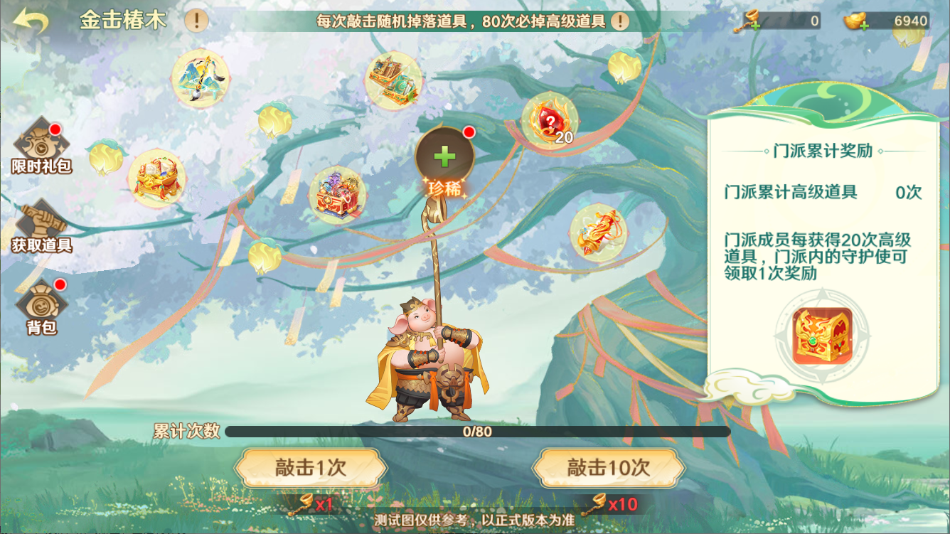 活动期间,让八戒使用金击子敲击白玉椿木使其掉落果实,即可获得掉落奖励,每次敲击都有概率掉落自选珍稀奖励和以下高级道具:限定红将碎片八选一、太虚兽典二选一、生花妙笔、灵宝任选箱、天工宝图、楚辞诗经任选。