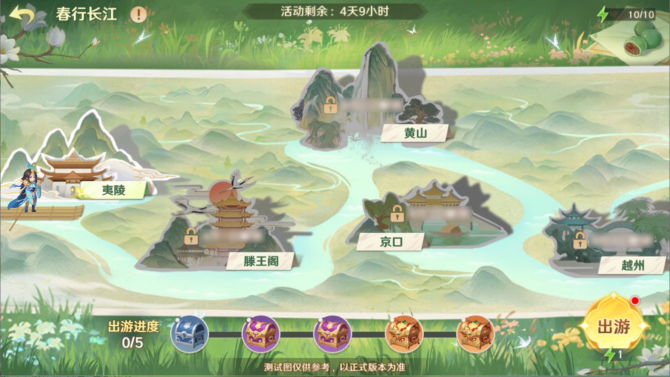 守护使大人可以按照游览路线在长江上进行游览,体验各个景点的剧情就可以获得出游进度奖励,每游览一个景点都可以获得神将好感道具、金击子以及蓝蝴蝶。