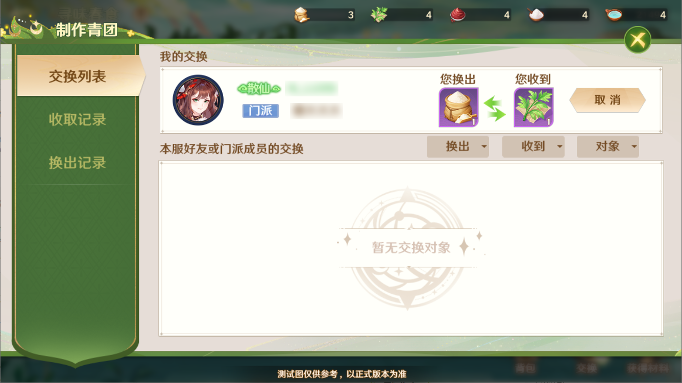 在活动中,守护使大人可以使用各种食材来制作青团,扫荡主线就有机会获得青团的制作材料,这些材料可以与好友或门派成员进行交换。