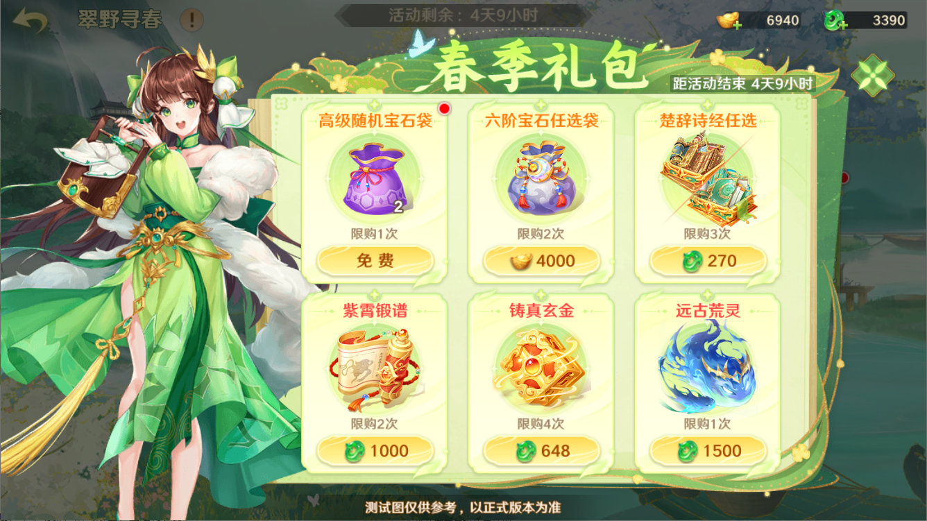 守护使大人可以在春季礼包中免费获得高级随机宝石袋,还有六阶宝石任选袋、楚辞诗经任选、紫霄锻谱、铸真玄金、远古荒灵供大家选购~