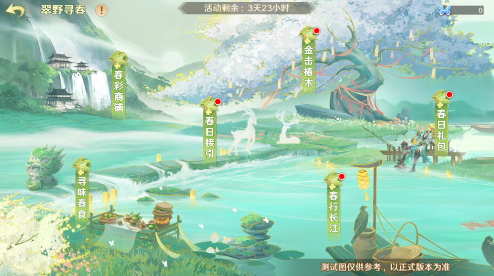守护使大人可以先在【春日接引】中签到获取奖励,同时查看活跃任务都有哪些;在【寻味春食】中参与制作青团就能拿奖励;春天乘舟江上也能看到很多美景,【春行长江】为大家规划好了路线,一起游览山河获得道具;在【金击椿木】里指挥八戒击落果实,让琳琅满目的宝贝掉下来;春天到了,礼包也为守护使大人准备好啦,各位可以去【春日礼包】中挑选道具哟;最后回到【春彩商铺】兑换想要的道具。