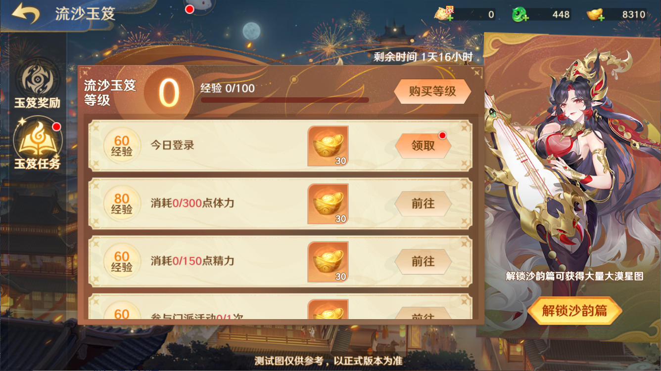 在流沙玉笈中,守护使大人可通过完成玉笈任务来获得元宝和玉笈经验,累积足够经验便能提升玉笈等级,达到对应等级后就能免费获得流彩篇的大漠星图奖励。若解锁了玉笈的沙韵篇,则守护使还能获得更多大漠星图奖励。