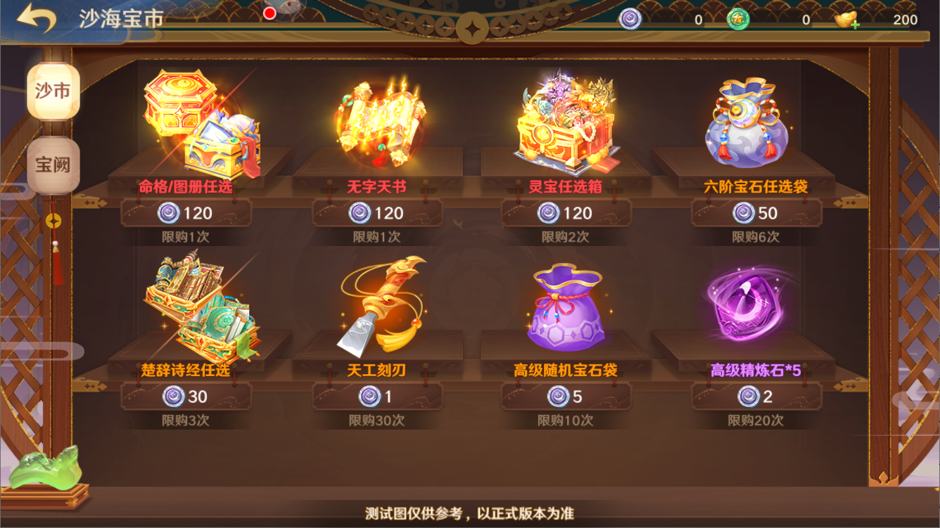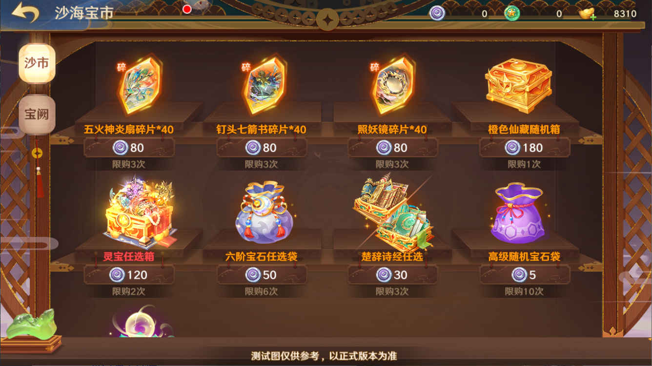 守护使大人可在沙海宝市的沙市分页,使用大漠古币兑换各种奖励道具,不同分组服务器可兑换的道具各不相同。