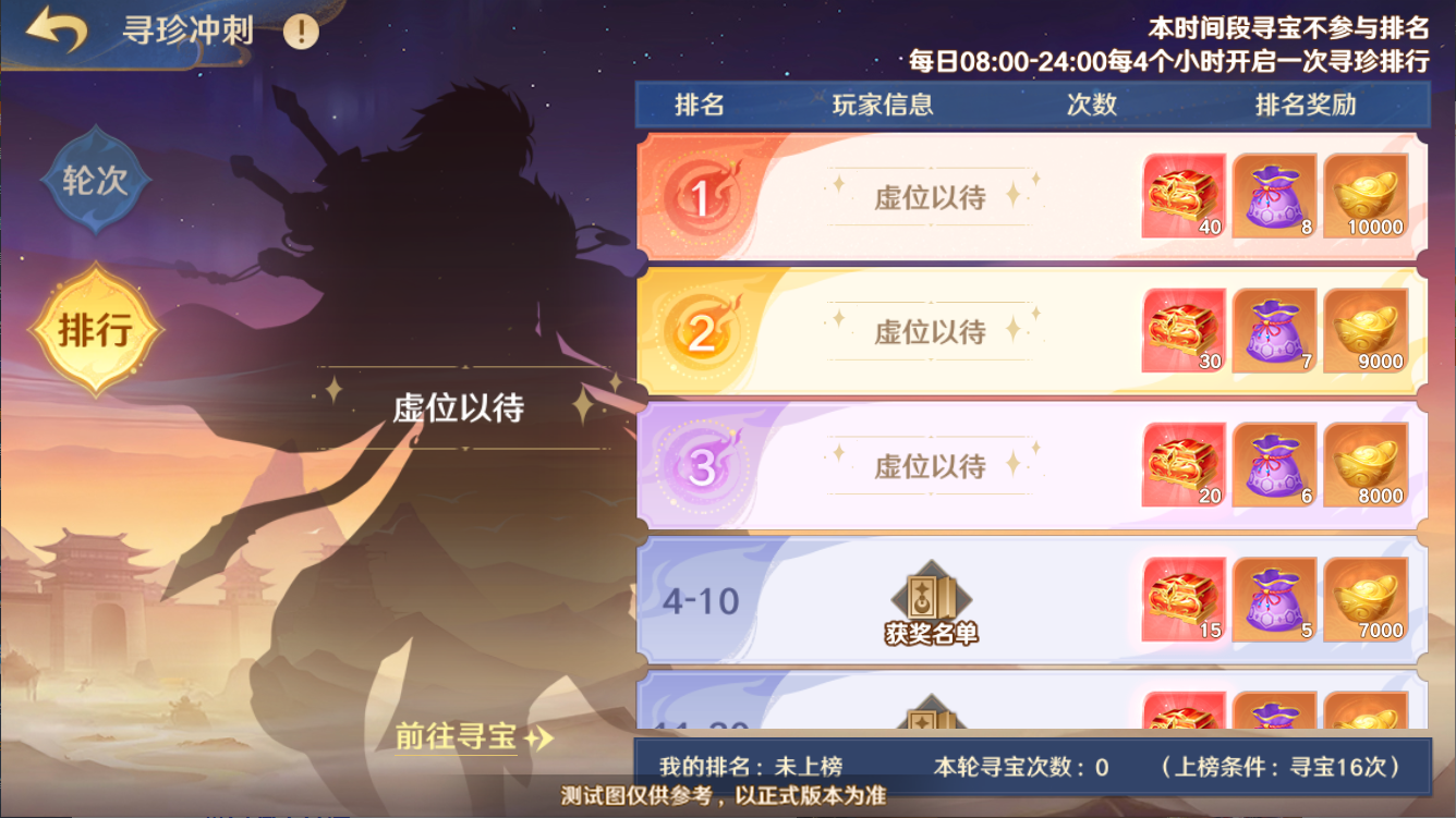 在活动期间,我们还会在每天的08:00~24:00,每隔4个小时开启一次全服参与的寻珍冲刺排行,展示期不会开启排行。排行会以守护使的寻宝次数进行排名,上榜的守护使将会在结算后获得对应数量的丝绸之路馈赠箱、高级随机宝石袋和元宝奖励。