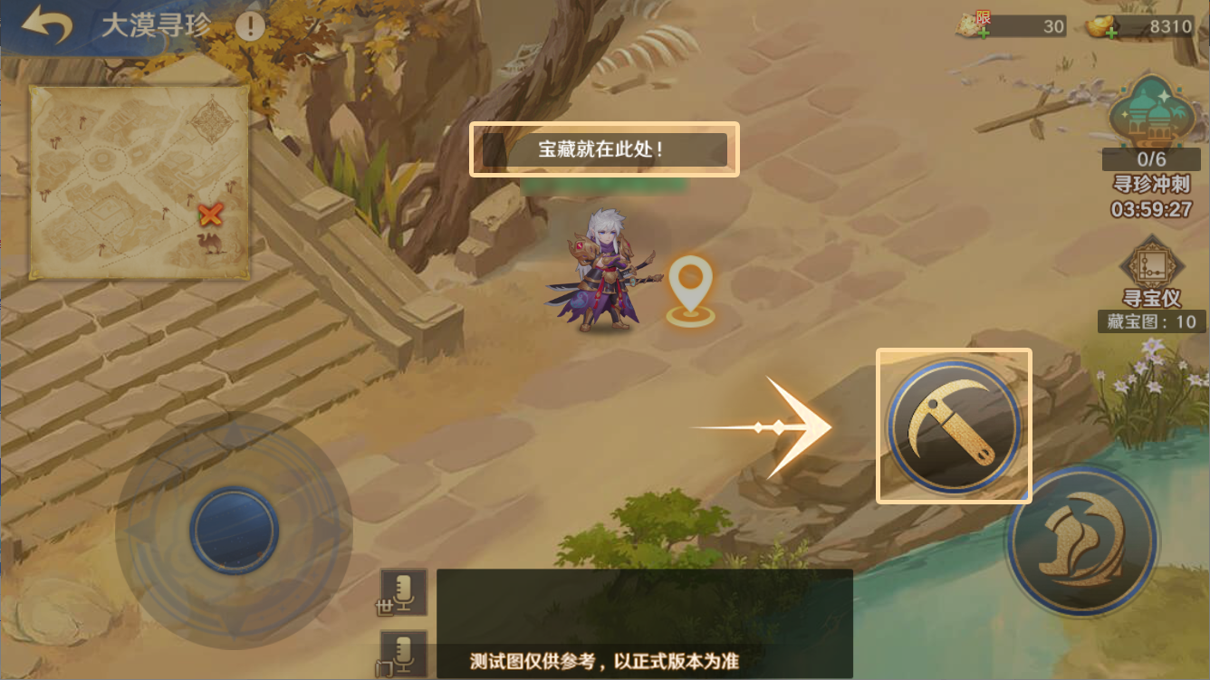 寻宝仪会告诉守护使大人宝藏的具体位置,参考左上角的小地图标识,根据提示找到寻宝点就能挖出宝物,获得道具奖励!不同分组的服务器将会获得不同的道具奖励。